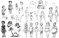 Most of the people in my children's book class chose stories that involve one character or a few characters, but I am working with Justin. This means two things as near as I can tell. First, it will be awesome when it's done, if it gets done. Second, it cannot be easy. I have to design at least one new character for every page of the book except maybe the last page, depending on the final format of the book. So it's been slow going. The class before last we had a review and I showed the following page of character designs: